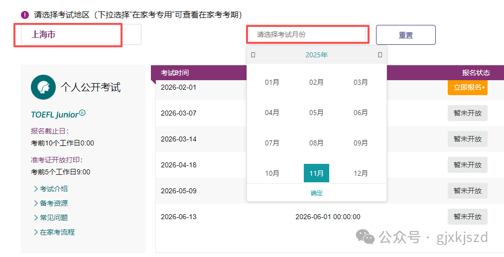 进入托福青少测试官网,选择上海,自行选择想要考试的月份,如果还有考试场次,点击【立即报名】即可。