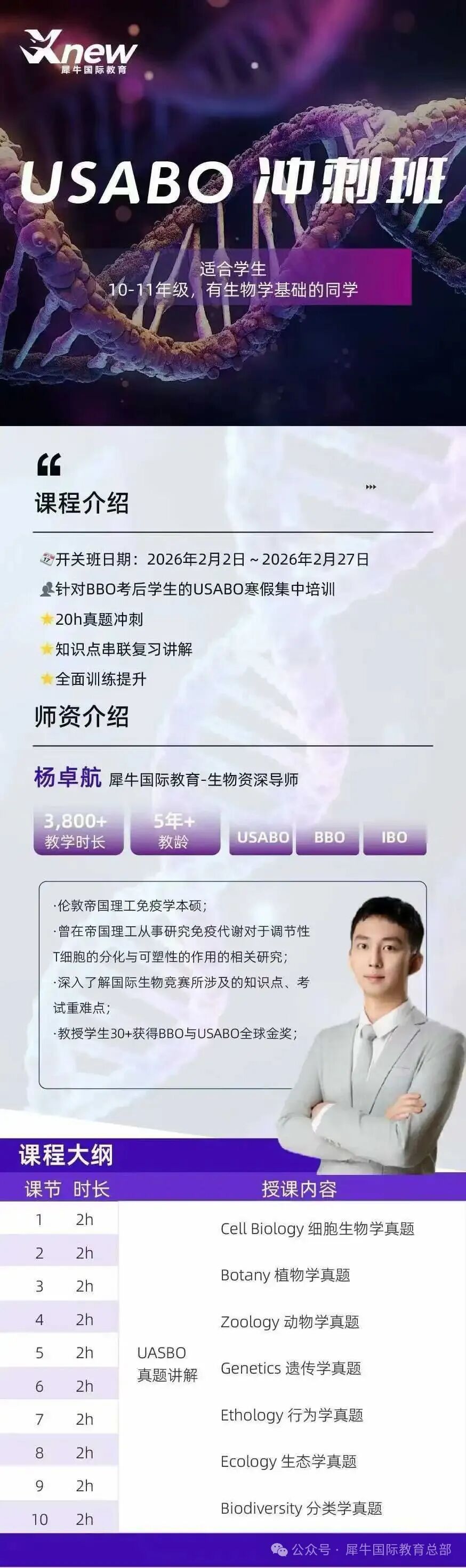 犀牛USABO生物竞赛培训辅导课程,由帝国理工导师亲授,助力同学们冲刺USABO生物竞赛金奖!寒假冲刺小班课课火热占位中,名额有限哦。