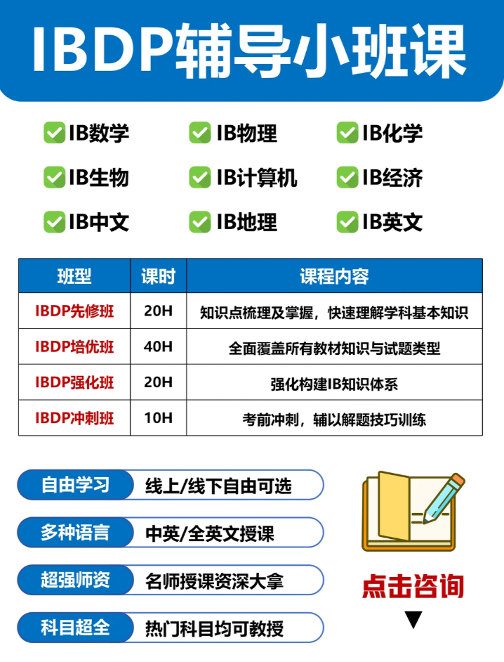 犀牛教育为准备IB考试的同学开设IB全科新班,3-6小班&一对一定制化课程,开设先修、培优、强化、冲刺课程。海内外名师全程督学,协助学员梳理IB课程知识点、难点及易错点。