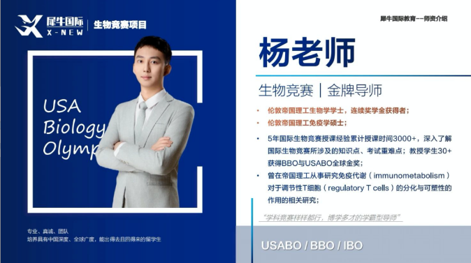 犀牛生物竞赛由杨老师带队,形成了专业的师资团队。熟知USABO竞赛考纲,出分稳定,获奖率超高!