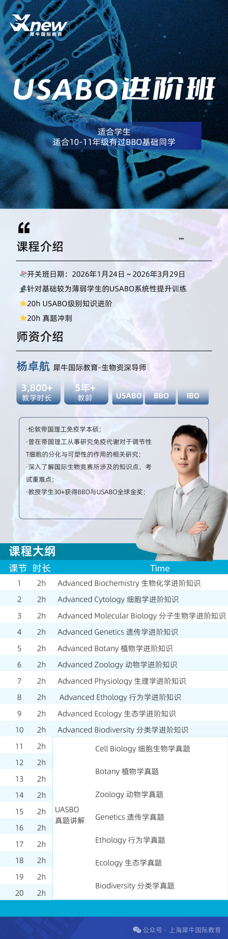 上海犀牛针对参加今年USABO考试的同学USABO进阶班,适合10-11年级有过BBO基础的学生。生物竞赛老师带队,用20h完成USABO知识的梳理巩固,用20h刷题模考冲刺直击USABO要害,带学生完成逆袭,冲刺金奖。上海浦东、徐汇、黄浦、闵行线下上课,可随时到校区了解。