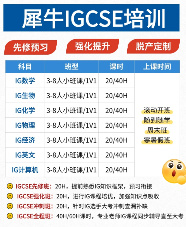 犀牛教育IG课程培训涵盖科目:IGCSE数学0580、IGCSE数学0606、IGCSE英文ESL、IGCSE物理、IGCSE化学、IGCSE生物、IGCSE经济、 IGCSE计算机等