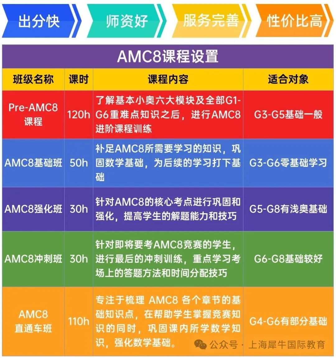 犀牛根据学生基础和目标分数开设AMC8基础班、强化班、冲刺班、全程班以及Pre AMC8全程班。