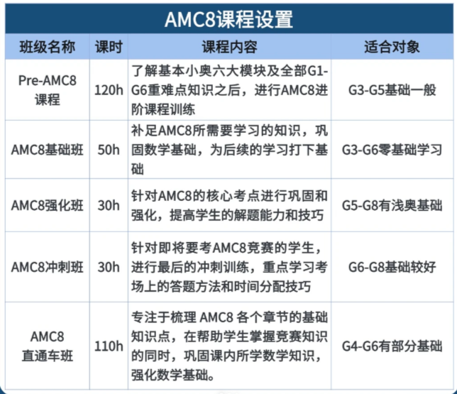 AMC8重难点竞赛知识,竞赛技巧,代数及高年级知识点,AMC8真题模考及难题进阶,冲刺奖项(约40课时)