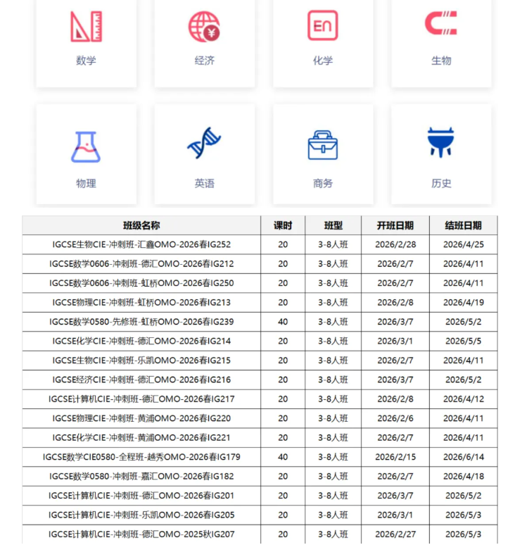 IGCSE春季班包含科目:IG数学/物理/化学/生物/经济等热门科目有班课,其他科目有一对一辅导
