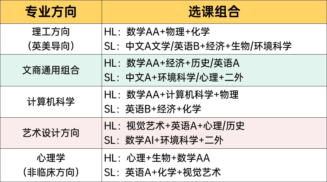 数学HL、专业对口的理科HL、中文SL、英文HL、商务管理SL/经济SL/环境科学SL/理科SL (四选二)