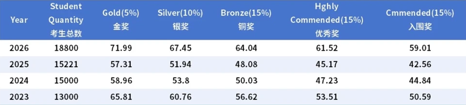 BBO英国赛区金奖、银奖、铜奖、优秀奖、入围奖分数线如下图分布!中国学生可根据此分数线进行估分,最终奖项分数线以官方公布为准!