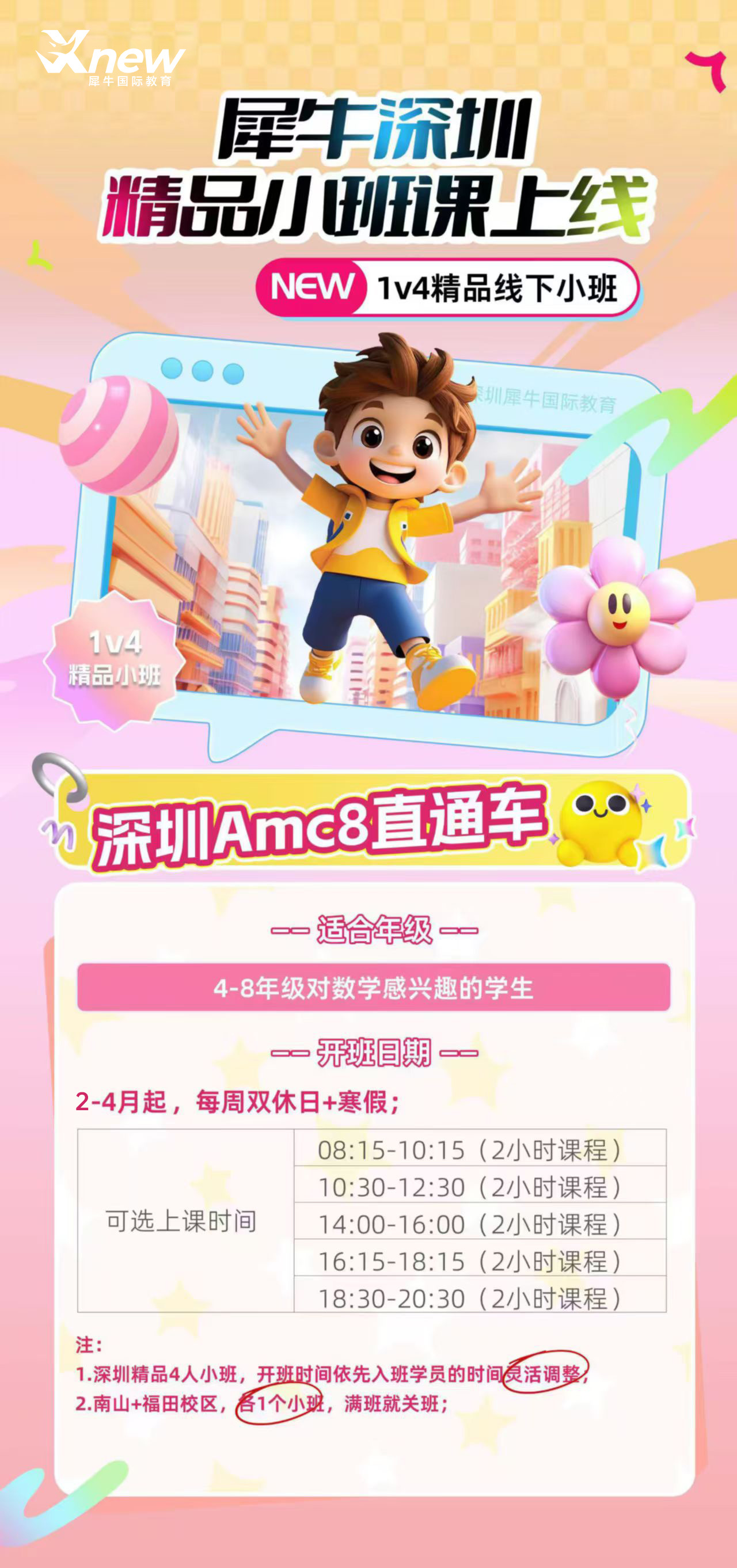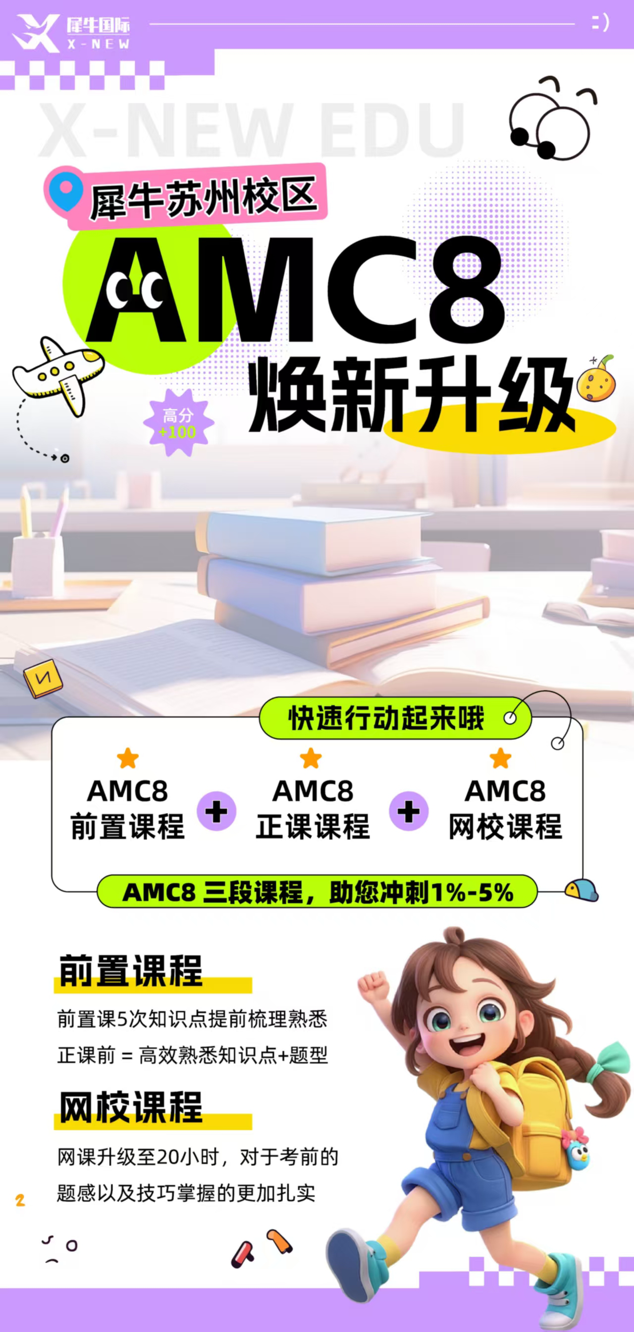 新赛季备考开始,有哪些amc8培训课程推荐的?犀牛amc8培训课程春季班3月新班报名开启,3-8人的小班课程,线上/线下同步上课的,全国30+校区可线下学习,距离校区比较远的同学可线上直接学习,超级方便,还在找amc8竞赛辅导课程的同学,可千万别再犹豫啦~