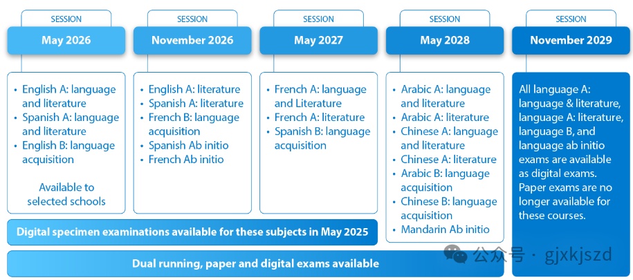 2025年5月,IBO将提供部分机考样本,供学校和学生熟悉机考形式,此时机考为可选项。2026年5月,少数学校将被选为试点,参加“语言和文学研究及语言习得”科目组的线上考试。从2026年11月起,所有学校均可选择是否参与线上考试,部分科目将同时提供机考和纸笔考试选项。