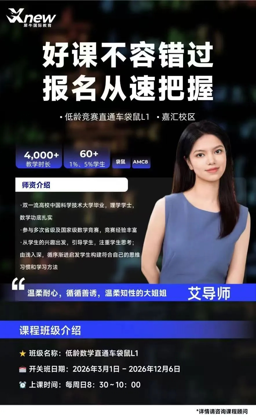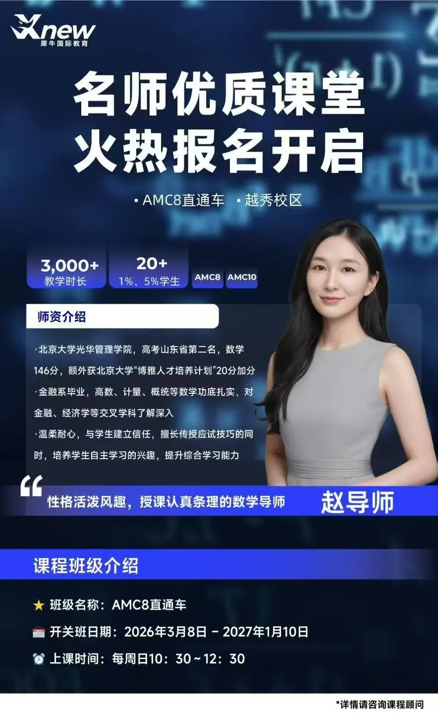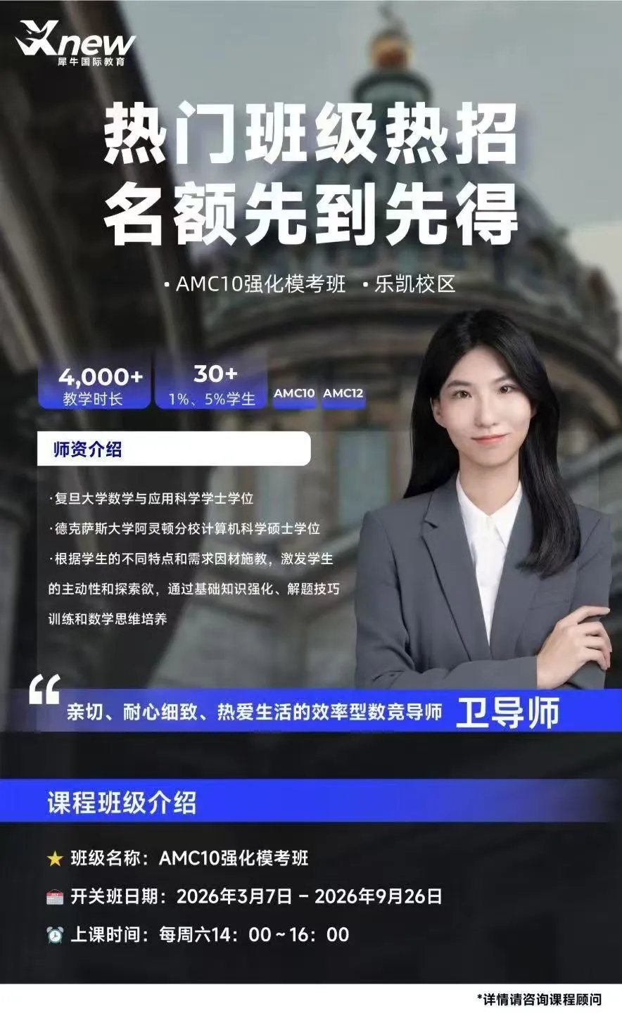 对于计划走国际路线、冲刺优质国际学校或海外名校的学生而言,AMC竞赛成绩是重要的学术背书,更是拉开差距的关键。上海犀牛3月AMC8、AMC10课程同步上线,分阶段、分层次教学,适配不同年级、不同基础的学员,助力孩子冲刺全球高分、晋级AIME,为升学增添重磅筹码。