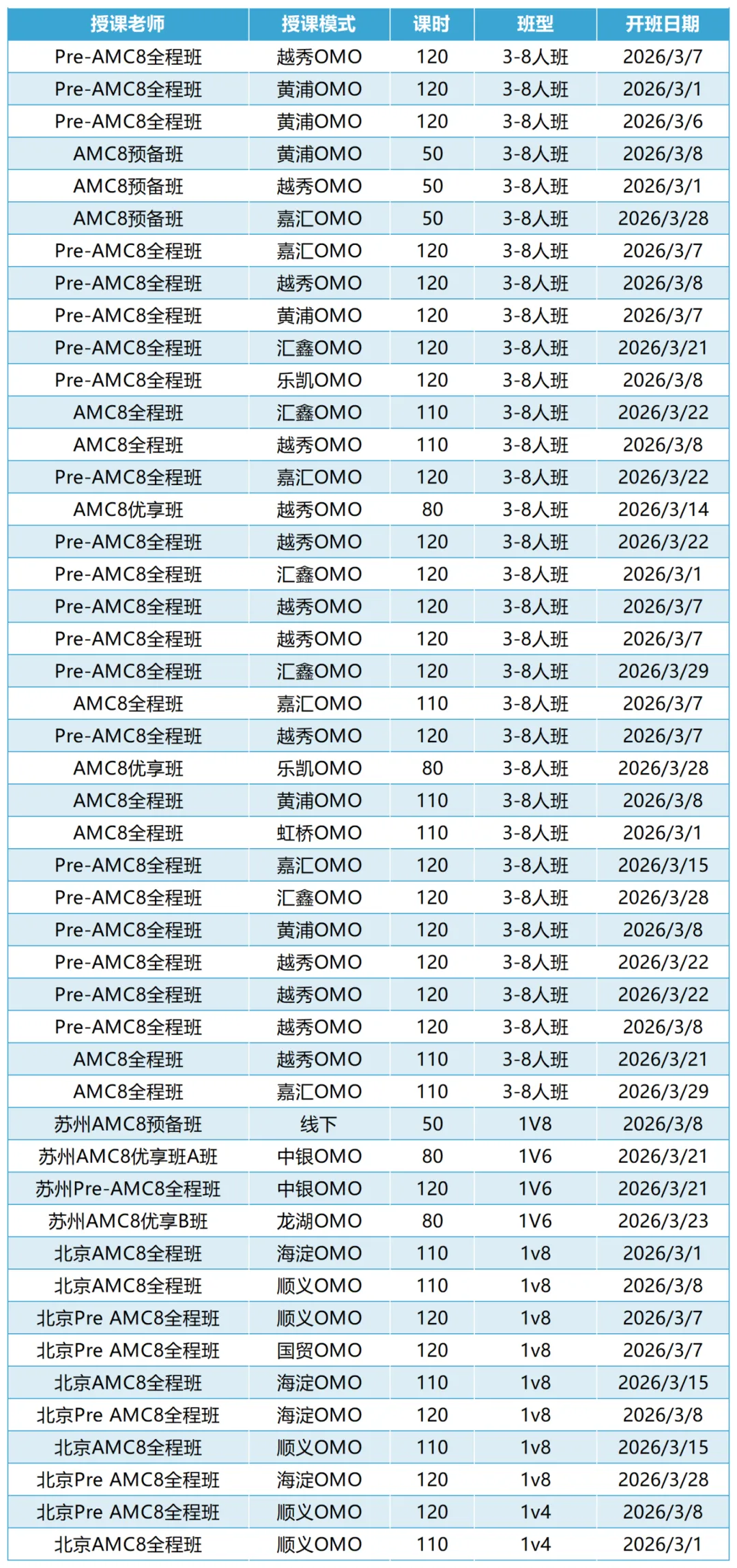 AMC8 备考黄金期来啦!犀牛教育AMC8春季班正式上线~上海、北京、苏州等多城开班,家门口就能上课!专为 3–7 年级设计,Pre-AMC8 全程班、AMC8 全程班、AMC8 优享班三档可选,零基础到拔高全覆盖,系统培养数学思维,长线备战 AMC8,全力冲刺全球前 1%/ 前 5%!
