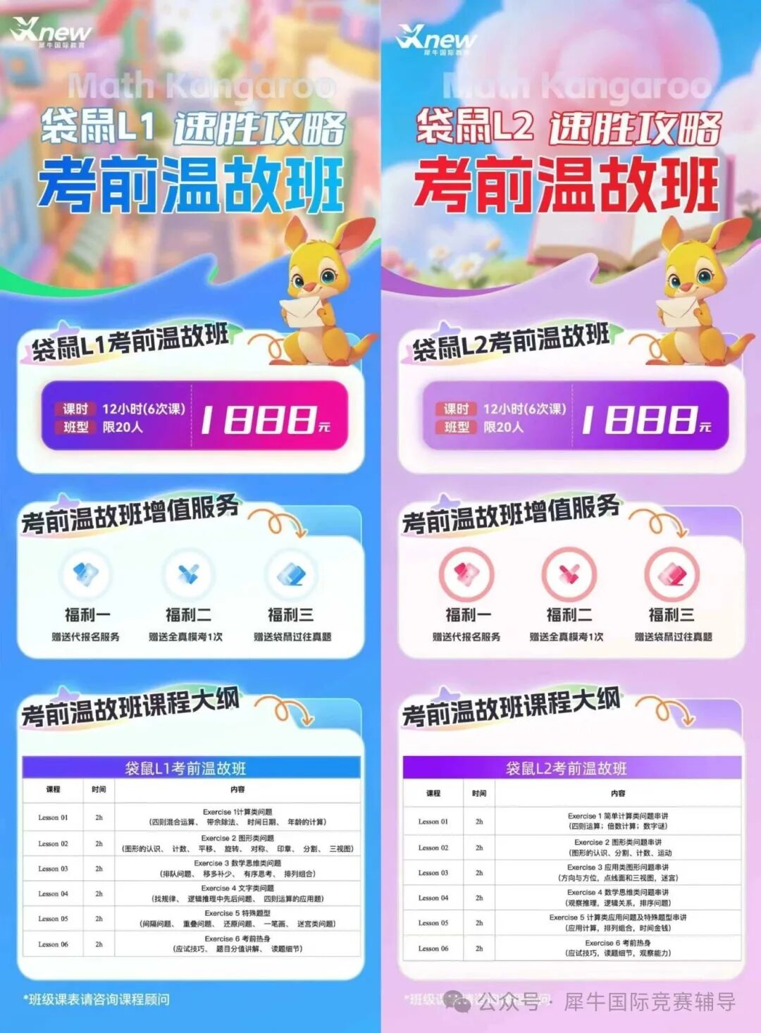 另外,犀牛这边开设有专门的袋鼠数学竞赛L1考前温故班课程,12小时的课程,同时还赠送: