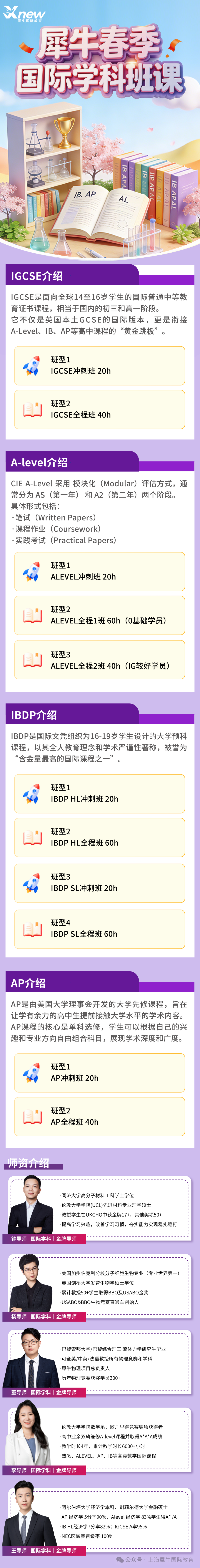 2026 IGCSE 夏季大考在即,还在为备考焦头烂额?你的考前救星来啦!犀牛教育专为冲刺夏季大考的同学推出IGCSE冲刺班,覆盖数学、进阶数学、物理、化学、生物、计算机、经济、英语(ESL/EFL)、历史、会计等全科科目。提供3-6 人精品小班与1 对 1 定制化辅导,紧扣考点、高效提分,助力冲刺A*!