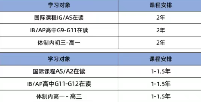2年制定制课程,是稳妥冲击G5等顶尖院校的优选方案,适合初三、高一学生、IG在读学生,或是基础一般但目标高远的学生,时间上很充裕,第一年学4-5门 AS,第二年攻3-4门A2.整体来说稳扎稳打~