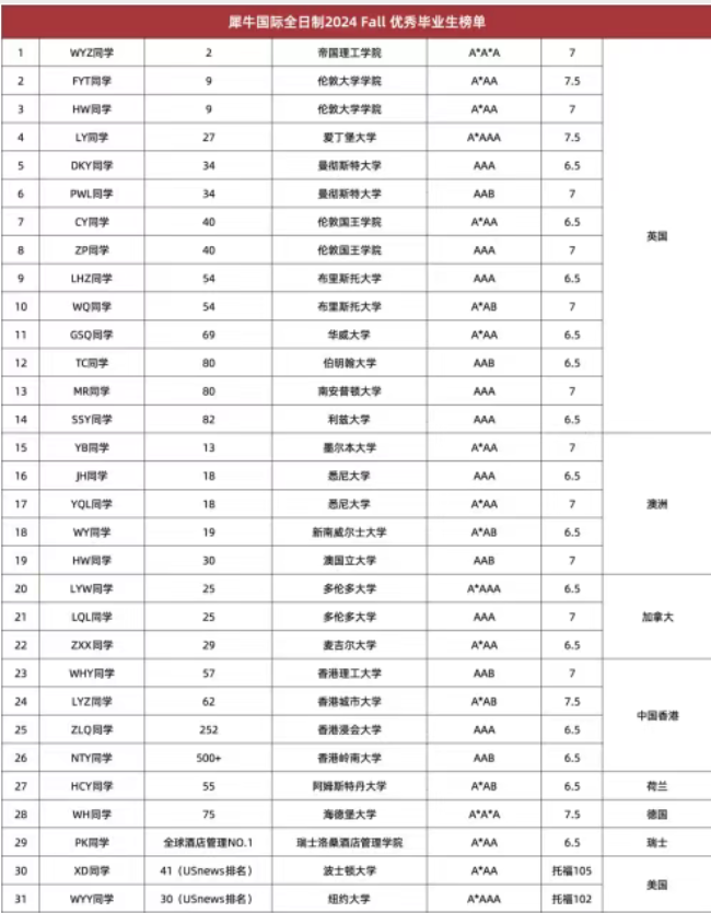 犀牛教育作为市面上深耕国际教育的老牌机构,ALevel脱产课程已经过数届学生的验证。通过犀牛学习Alevel脱产的课程的优秀学员,从犀牛出发,顺利踏入世界知名学府,下方为部分Alevel脱产部分优秀毕业生榜单,供家长跟学生们进行参考。