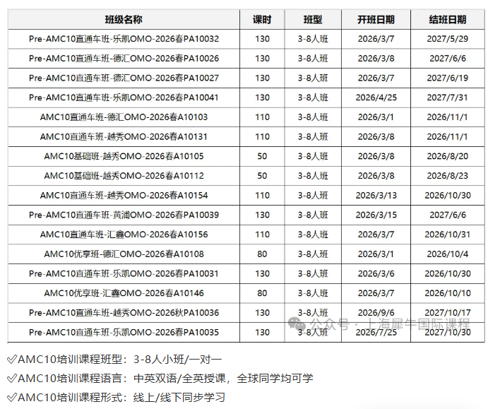 2026年AMC10竞赛长线系统备考班已经开始,犀牛AMC10全程班110小时包括基础+强化+冲刺一站式备考,犀牛金牌名师带你冲AMC10前1%!犀牛AMC10培训课程针对不同基础的孩子开设多种班型课程,线上线下同步授课,专业AMC培训师带你稳扎稳打直冲前1%,AMC10课程详情咨询门店客服~