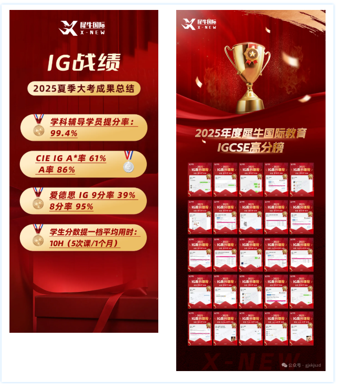 犀牛学员在2025年夏季大考中出分显著,学科提率达99.4%,CIE IG A*率61%,A率86%;爱德思IG 9分率39%,8分率95%
