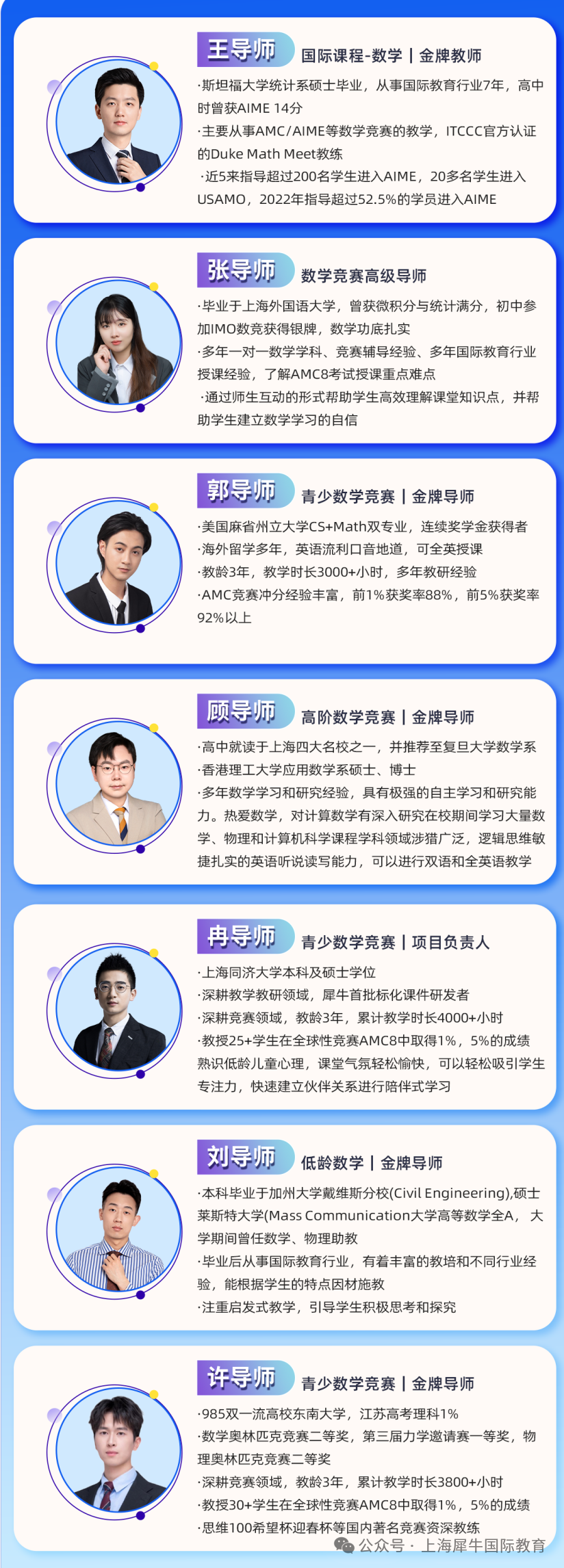 犀牛AMC10竞赛老师多毕业于斯坦福、香港理工大学、北京大学、复旦大学等国内外知名大学,平均教龄超2000小时,带出很多AMC10高分学员。