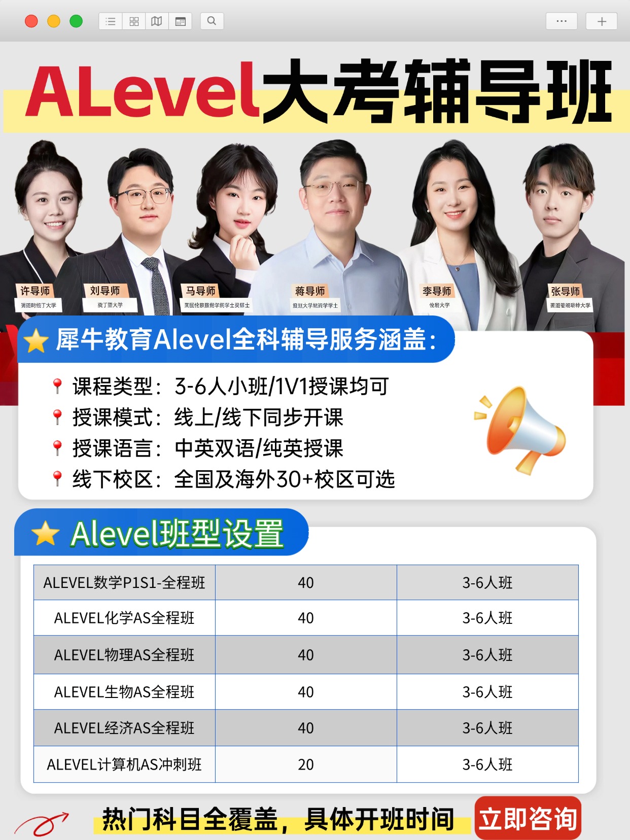 在辅导范围上,犀牛教育的ALevel全科辅导班实现了全科目覆盖。
