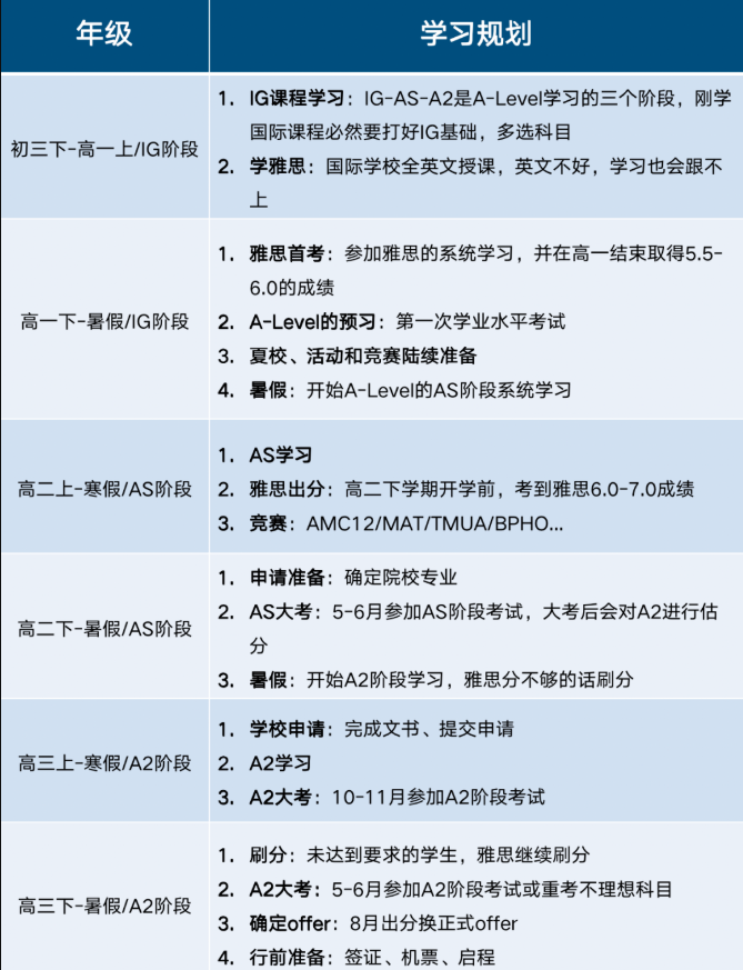 在Alevel三年学习过程中要穿插进行雅思和ALevel的备考,确保高三前拿到大学申请要求的标化成绩,之后的寒暑假则用来参加夏校、背景提升项目等活动!