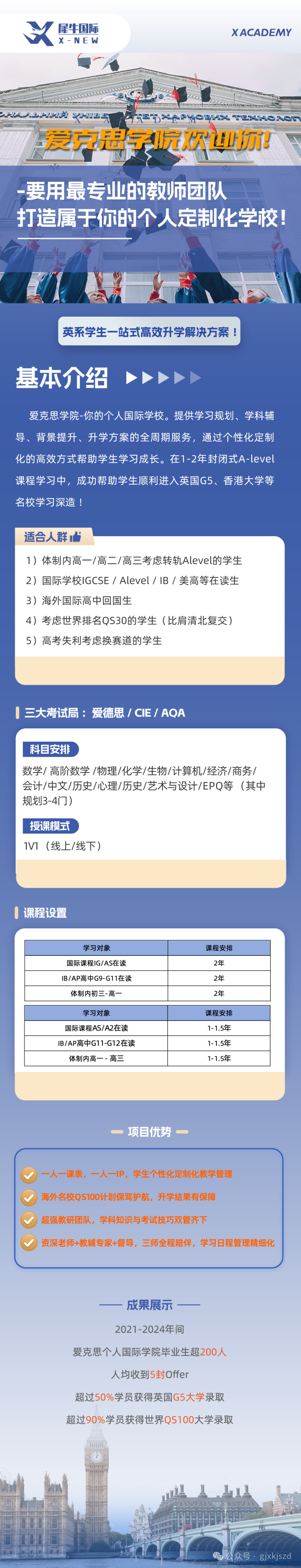 课程内容:完成整个AS+A2阶段的学习,雅思、学科竞赛、夏校项目、科研项目,留学申请同步完成。