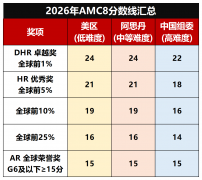 所以中国组委会今天公布了2026年AMC8获奖分数线