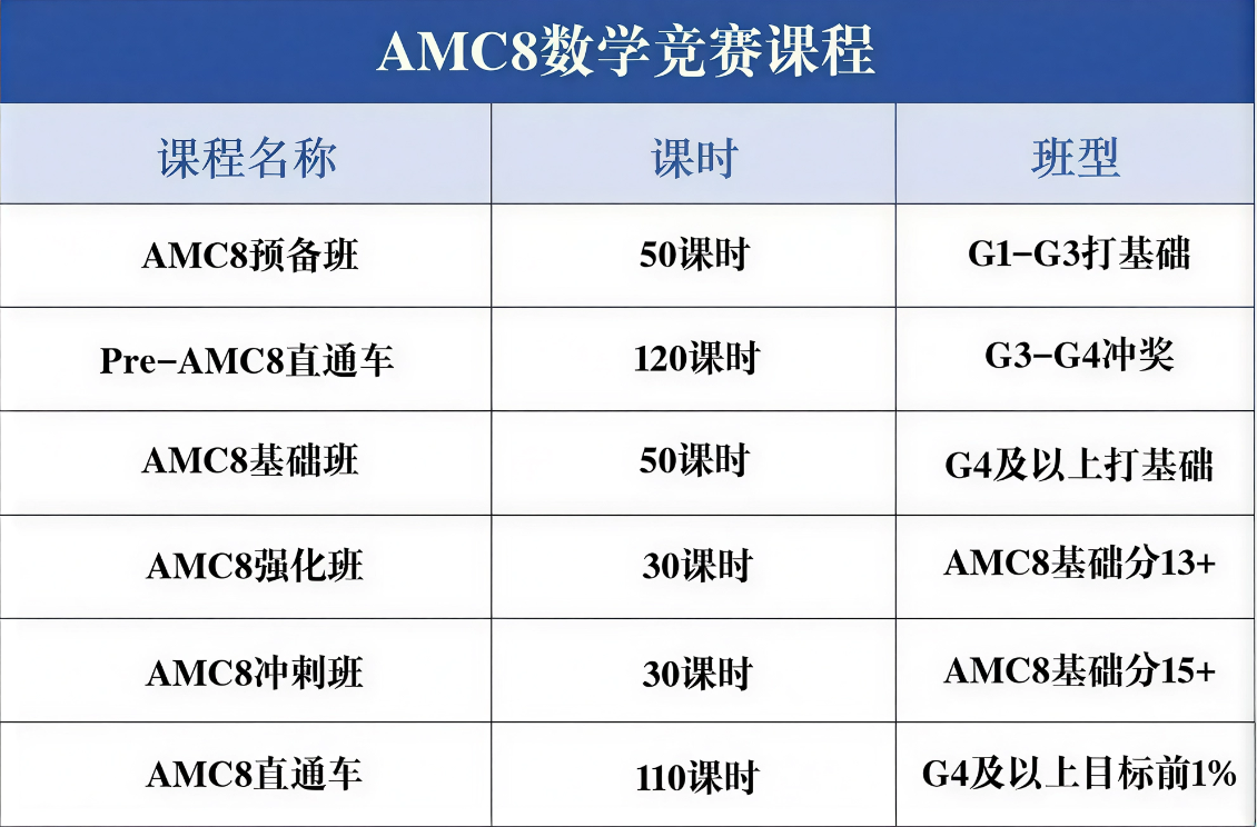犀牛针对AMC8竞赛不同基础的学生,特别开设不同阶段的培训课程,比如:AMC8预备班,PreAMC8全程班,AMC8全程班,AMC8基础班,AMC8强化班,AMC8冲刺班,AMC8优享班等多个类型的AMC8培训课程,都是根据同学们的基础情况来匹配的。