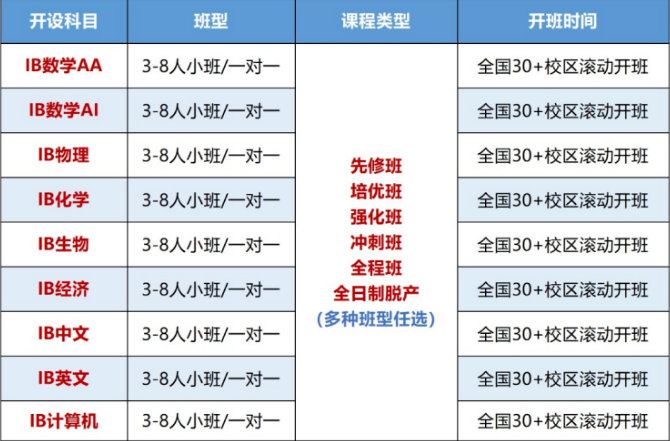 IB Business Management、IB心理学(Psychology)、IB地理(Geography)、IB物理(Physics)、IB化学(Chemistry)、IB生物(Biology)、IB数学AA、IB,Al包括HL和SL不同难度级别