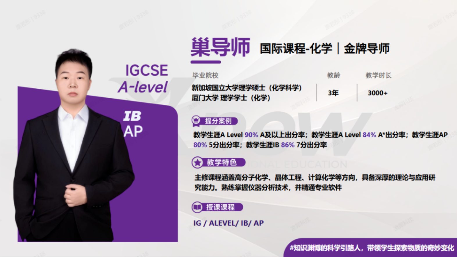 伦新加坡国立大学硕士,IB化学86%的出分率,能够带领学生探索物质的奇妙变化。