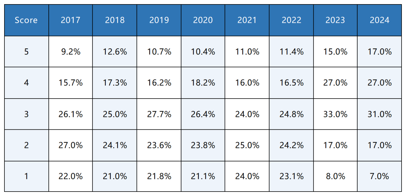 对比其他的AP课程,AP化学的5分率整体非常低。