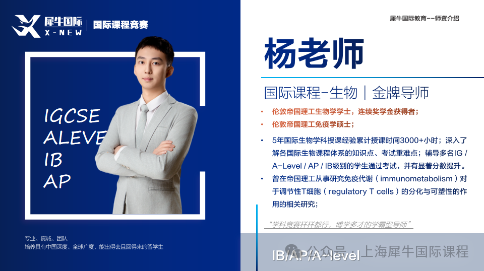 杨老师:犀牛国际教育生物组金牌讲师