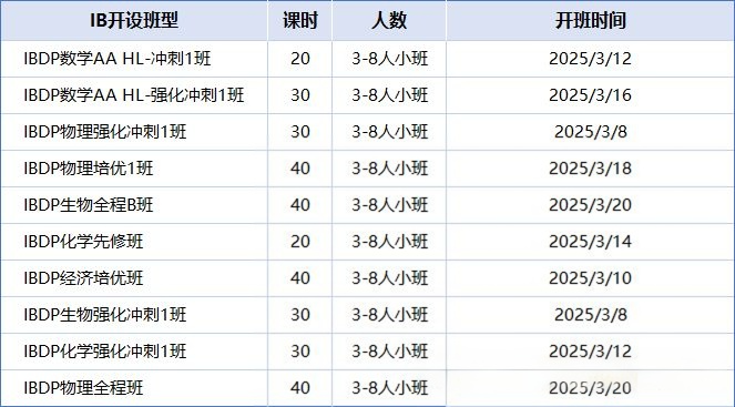 IB培训课程科目:IB数学、IB物理、IB化学、IB生物、IB经济、IB计算机、IB商务、IB中文、IBEE、IBTOK等等;