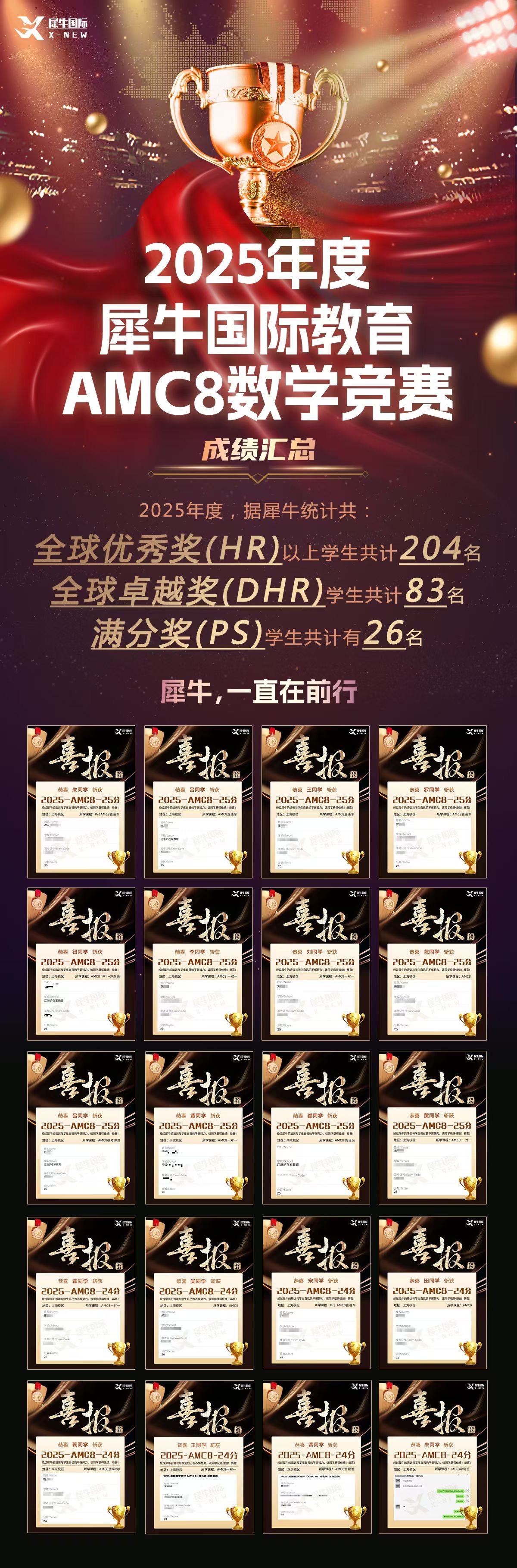 2024-2026年,犀牛AMC8学员800+获奖,其中满分奖81名,全球前1%、前5%学员600+,想要在AMC8比赛中拿到好成绩必选上海犀牛。