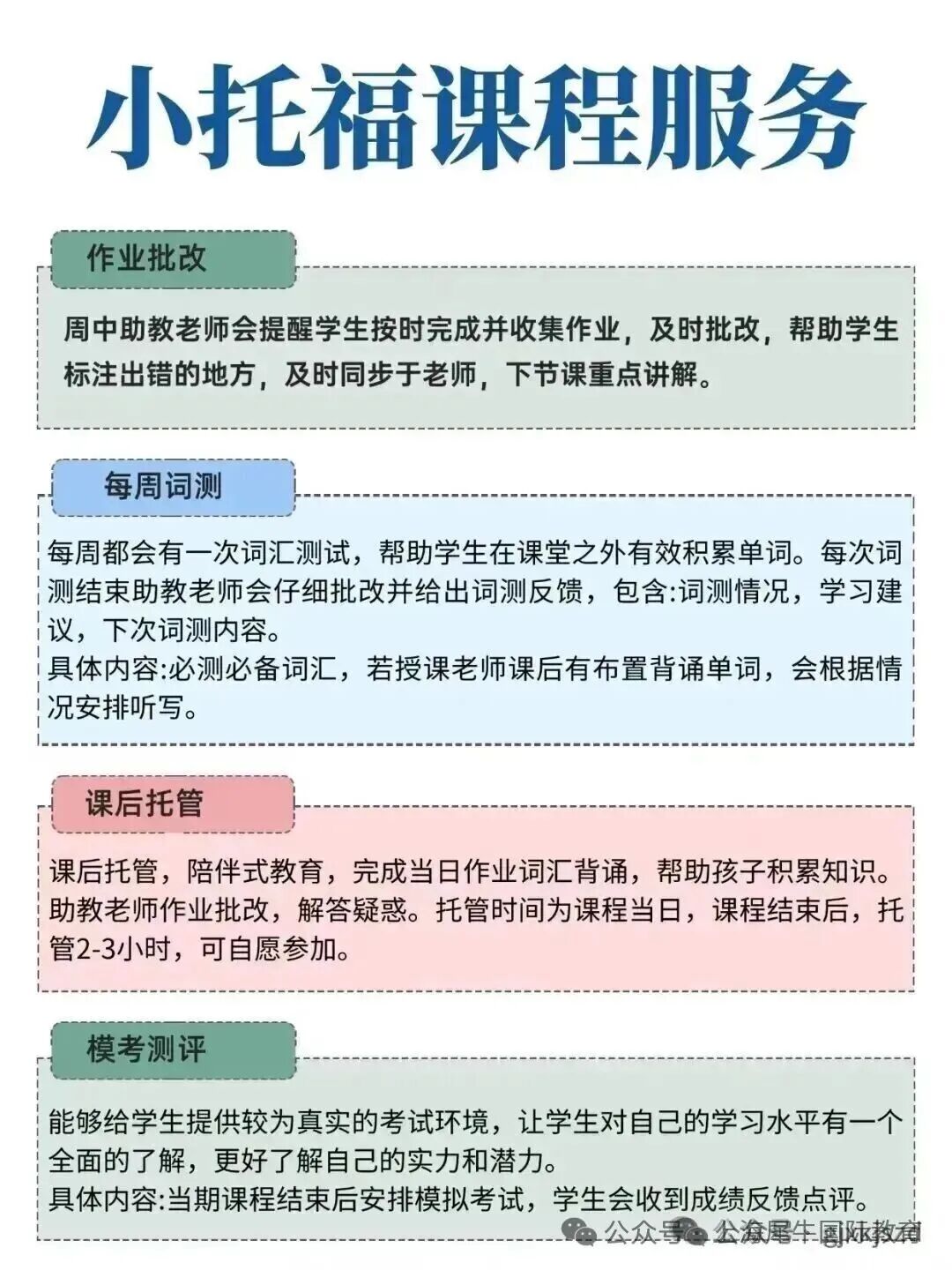 犀牛小托福课程完整服务流程:包含前测→选班→入班→建立班主任+老师+家长沟通群→进行课前提醒和课后反馈,以及课后作业答疑等环节,全方位保障学生的学习效果。