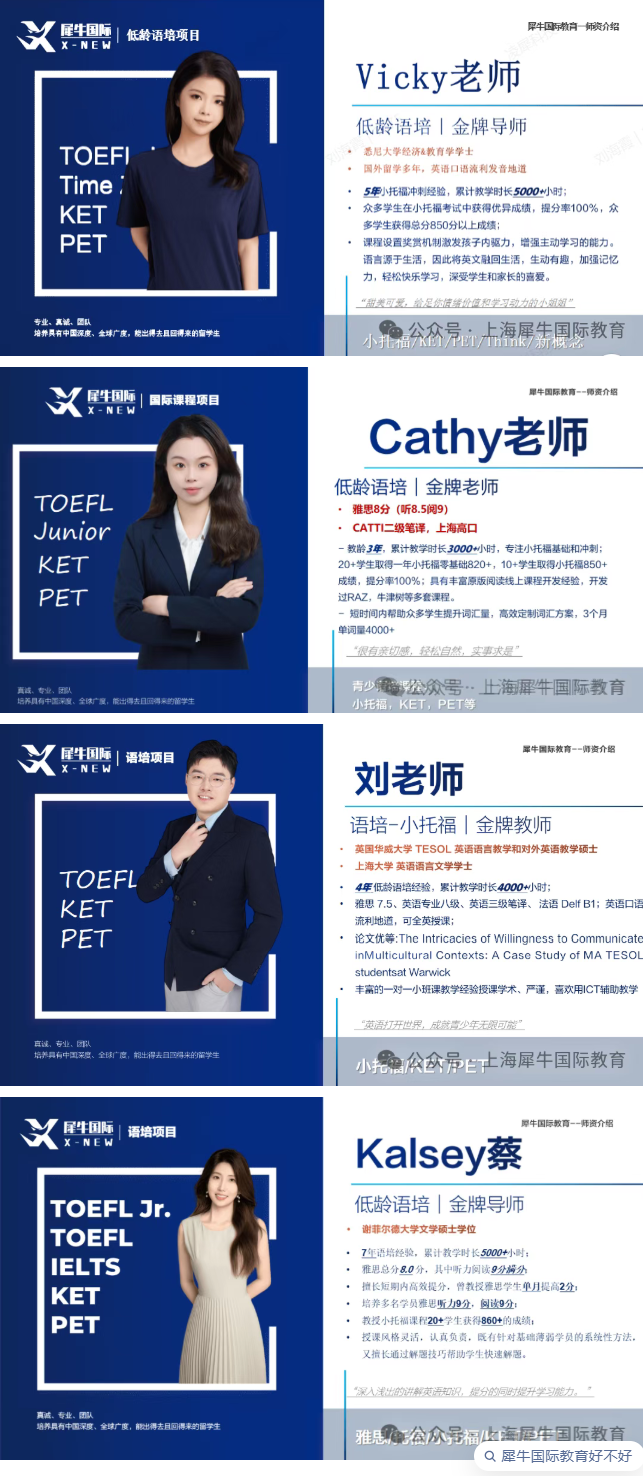 犀牛徐汇/浦东小托福授课教师均为ETS官方认证师资,汇聚海内外TOP名校人才,精通小托福考试逻辑、高频考点与命题趋势,擅长将复杂知识点拆解易懂,搭配独家自研讲义,结合历年真题精准提炼重难点,从词汇、语法、听力、阅读四大模块专项突破。