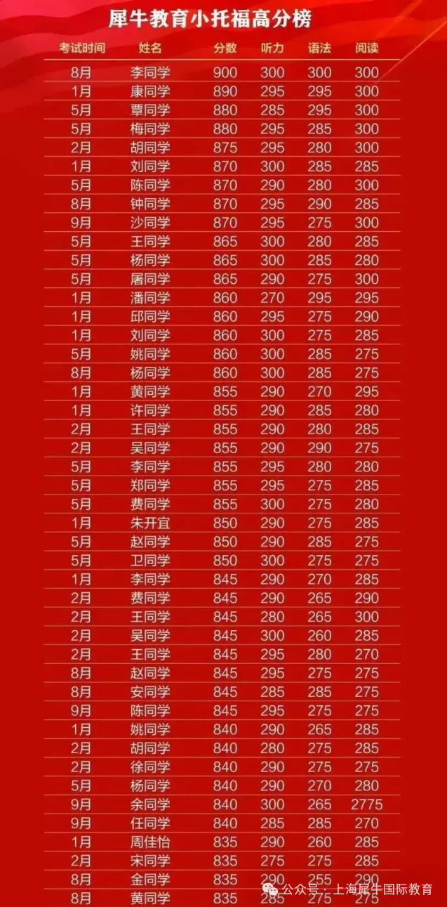 犀牛小托福师资水平在线,优秀的出分情况就是有力证明,这是2025年犀牛小托福学员的成绩,27位同学取得了850+的好成绩,还有一位满分学员,大家知道小托福对的难度,能拿到满分成绩太棒了。