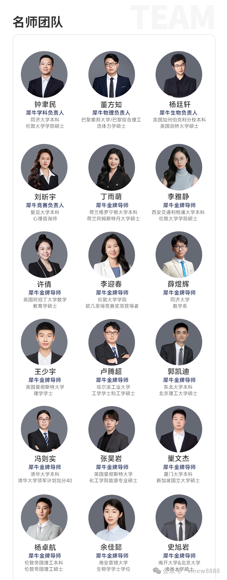 犀牛IGCSE辅导培训课程师资涵盖IGCSE数学、IGCSE物理、IGCSE化学、IGCSE生物、IGCSE经济等多个科目辅导老师,教学经验丰富,专业功底扎实,不仅对IGCSE课程的备考重点、难点、考察规律等非常熟悉,还知道怎么教,帮助多名同学们在国外的备考中取得了不错的成绩。