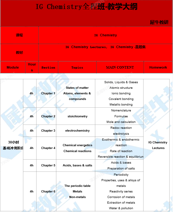 1、根据IGCSE化学课程大纲,学习12章节核心知识点内容;