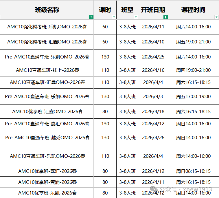 犀牛教育针对AMC10竞赛开设了多种班型,包括但不限于Pre-AMC10课程、AMC10课程基础班、AMC10课程强化班、AMC8课程冲刺班等,以满足不同学生的需求: