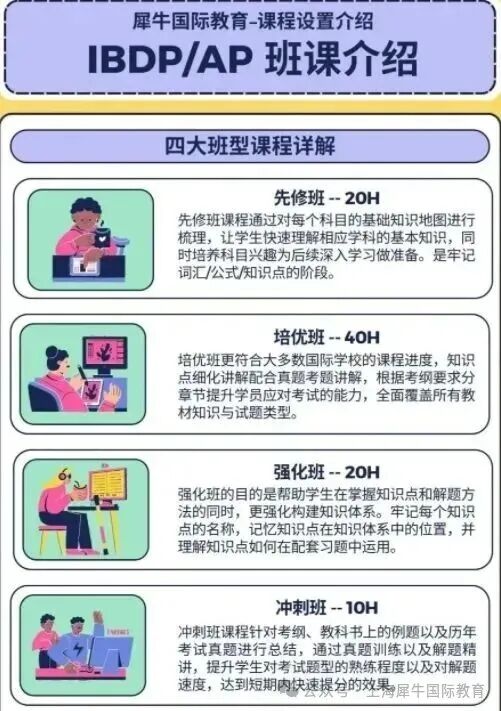 机构提供IBDP六大学科组(数学、科学、人文、语言等)及 TOK、EE、CAS三大核心课程的全覆盖辅导,同时开设先修班、同步培优班、强化班、考前冲刺班四大班型。适配零基础预学、校内同步提升、考前冲分等不同需求,让每位学生找到适合自己的学习节奏。