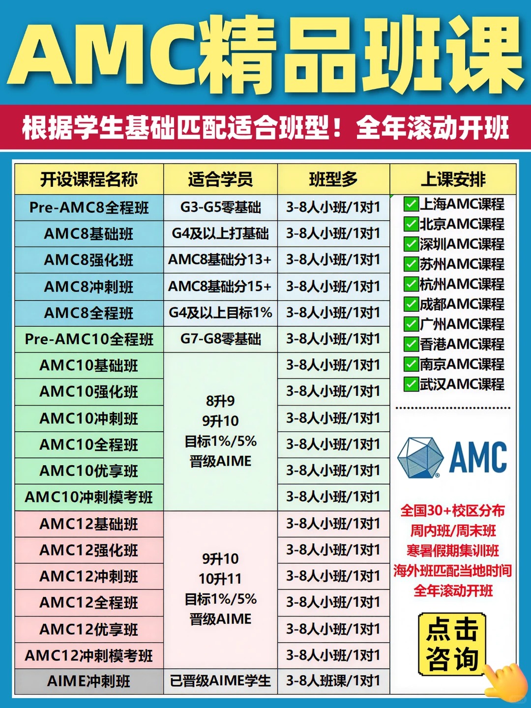 从Pre-AMC8(基础)到强化、冲刺,一步一步来,还有自研教材、真题精讲、模考复盘,让孩子每刷一道题都有收获,不是瞎忙。