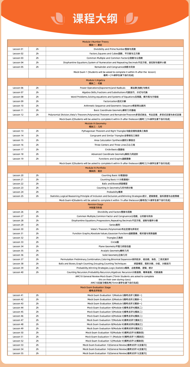 AMC10涉及的部分知识点,如数论、组合在初中校内较少涉及,需要提前铺垫。这个阶段如果还没考AMC8.建议先考AMC8.