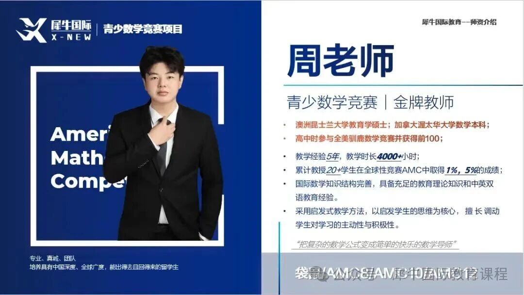 犀牛AMC10培训师资均是藤校清北复交毕业师资,在AMC10等国际数学竞赛方面教龄5年以上,教学经验丰富,让AMC10备考的学生轻松理解!AMC10课程培训辅导咨询网站客服。