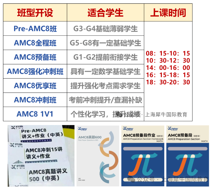 1、课程成体系:犀牛AMC竞赛教研组老师经过多年研发,不断的更迭,研发出适合不同基础学员备考的AMC8竞赛课程。