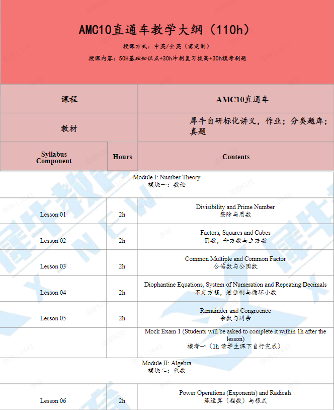 犀牛做AMC10竞赛培训多年,拥有适合6~10年级学生的不同基础的AMC10课程,全国线下30所校区,支持线上教学,需要AMC10课程培训的家长,欢迎了解~