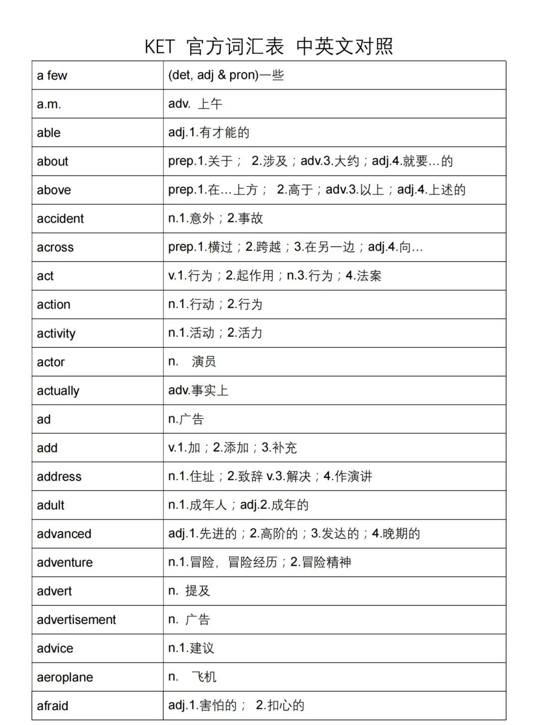 按照字母顺序列出KET要求掌握的所有词汇,家长可以下载打印供孩子默写。