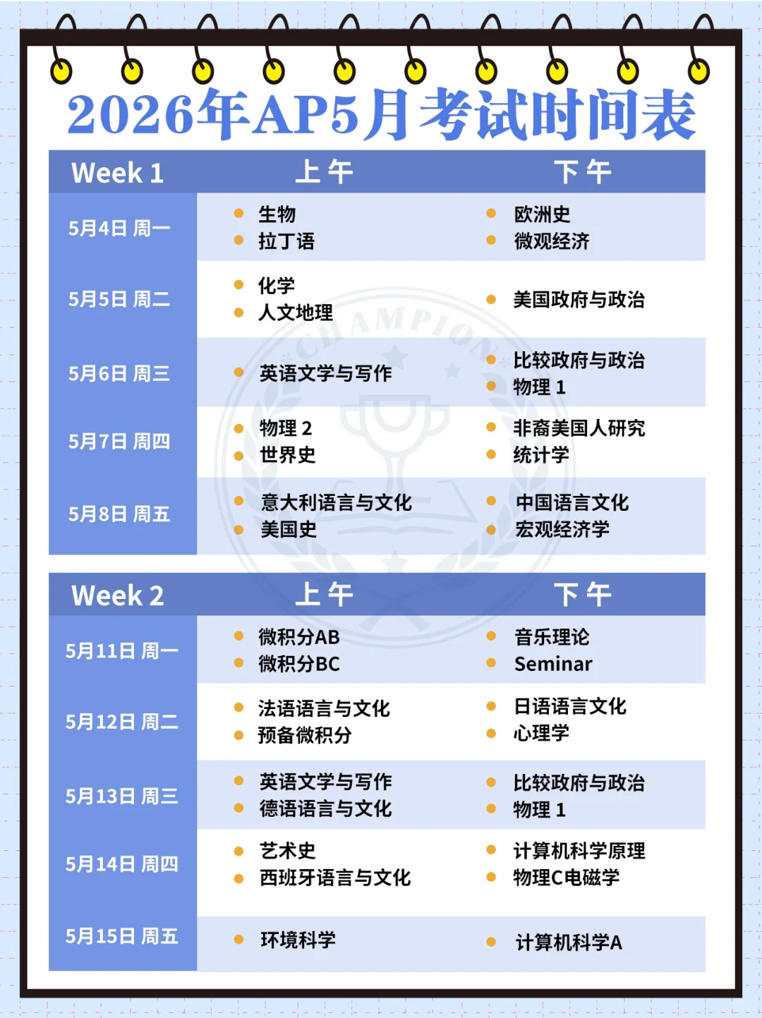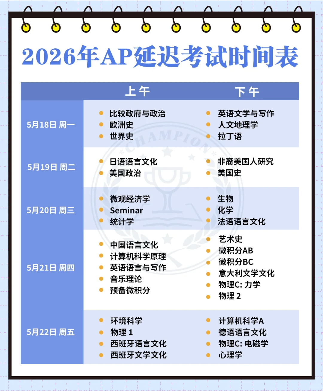 AP大考即将来临,复习得怎么样了?这里列出了AP五月大考时间,收藏起来列好备考计划吧~