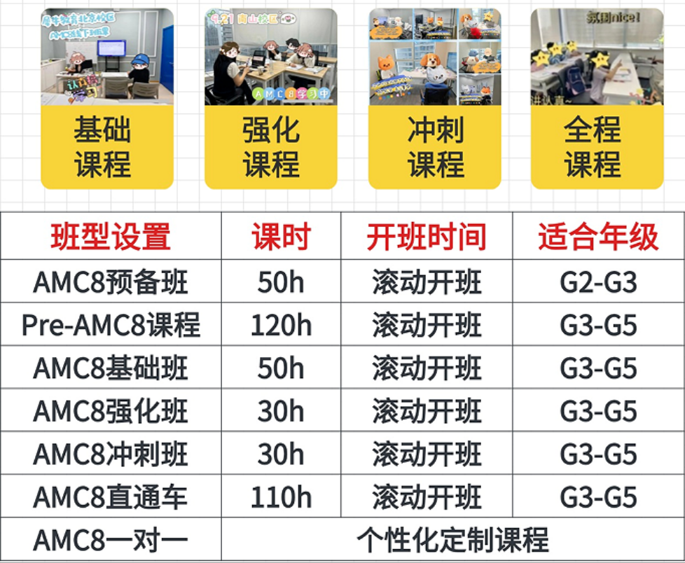 AMC8课程:基础班(50小时)+强化班(30小时)+冲刺班(30小时)三个部分