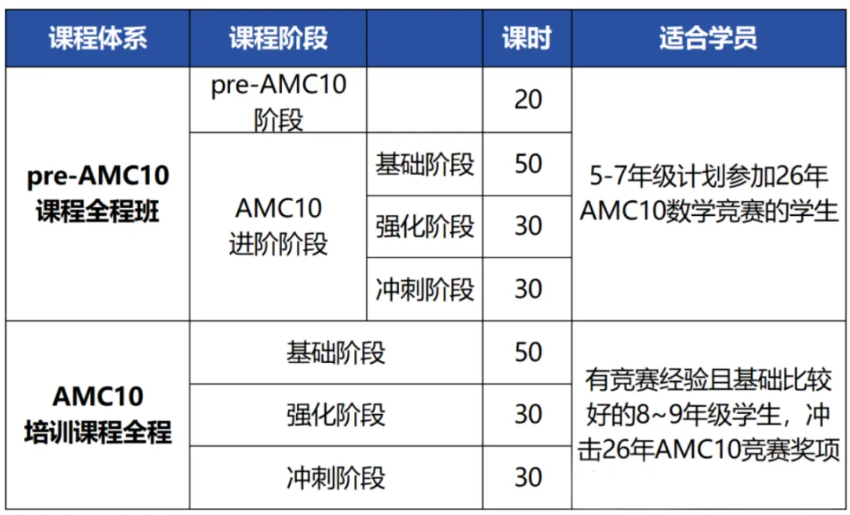 通常9-10年级学生是AMC10竞赛参赛主力军,而随着AMC10竞赛含金量被越来越多名校和学生认可,参加AMC10培训的学生中也有不少6-8年级学生。由于不同基础学生对AMC10知识点吸收和理解不同,以及备考目标不同,犀牛AMC10培训分层教学,开设Pre AMC10直通车和AMC10全程班两大体系课程: