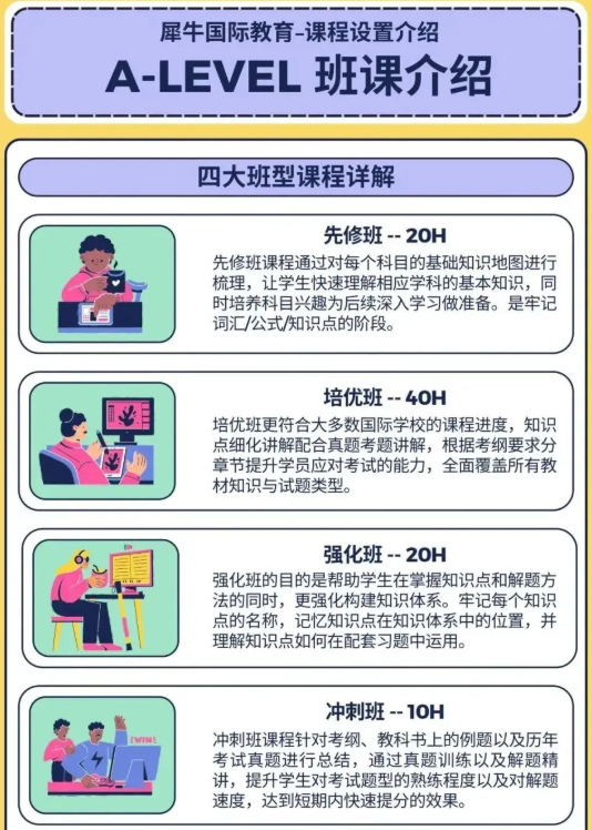 犀牛针对ALevel课程不同阶段的备考都开设有对应的ALevel培训课程,包含ALevel预习班,ALevel强化班,ALevel大考冲刺班,ALevel同步培训班,ALevel全日制脱产课程等等,帮助同学们搞定每个备考阶段所遇见的问题。